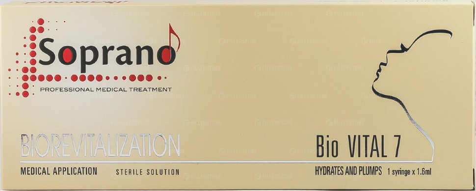 Soprano Bio Vital 7 содержит немодифицированную гиалуроновую кислоту премиального качества высокой степени очистки. Длина молекулы – 3 100 000 Да, что обеспечивает пролонгированное увлажнение и более длительное нахождение гиалуроновой кислоты в тканях.