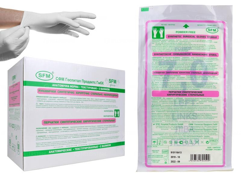 Перчатки синтетические стерильные полиизопреновые Перчатки синтетические стерильные полизопреновые созданы для дополнительной защиты пациентов и пользователей во время хирургических операций, лечения и обследования. Перчатки синтетические стерильные неопреновые имеют изогнутые пальцы для анатомической конструкции, чтобы уменьшить усталость рук. Перчатки из неопрена имеют текстурированную поверхность по всей площади, чтобы избежать скольжения. Перчатки оптимизированы для влажного надевания. Манжета - валик на синтетических стерильных неопреновых перчатках хорошо удерживается на руке. Перчатки синтетические стерильные полизопреновые подходят только для одноразового использования. Производство SFM Hospital Products GmbH, Германия белого цвета; материал - полиизопрен; анатомические (разделение на правую и левую руки); текстурированные, микрошероховатая поверхность по всей площади; неопудренные; стерильные;