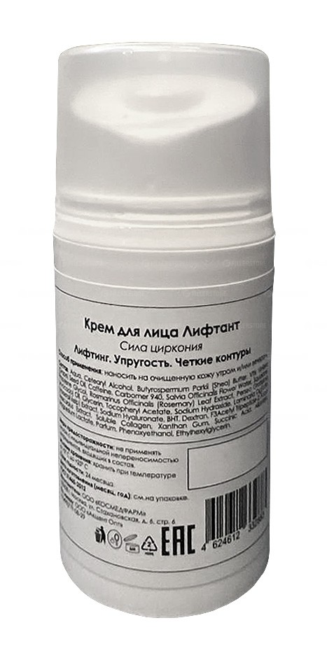 В состав крем-лифтинга входит уникальное мощное сочетание активных ингредиентов. К ним относятся: вода, масло ши, масло виноградных косточек, кофеин, сквалан, биоактивный гидролат розмарина, масло авокадо, стабильный витамин Е, гиалуронат натрия, экстракт ламинарии, декстран, F3Трипептид 2, экстракт фукуса, коллаген, янтарная кислота, минеральная пудра.