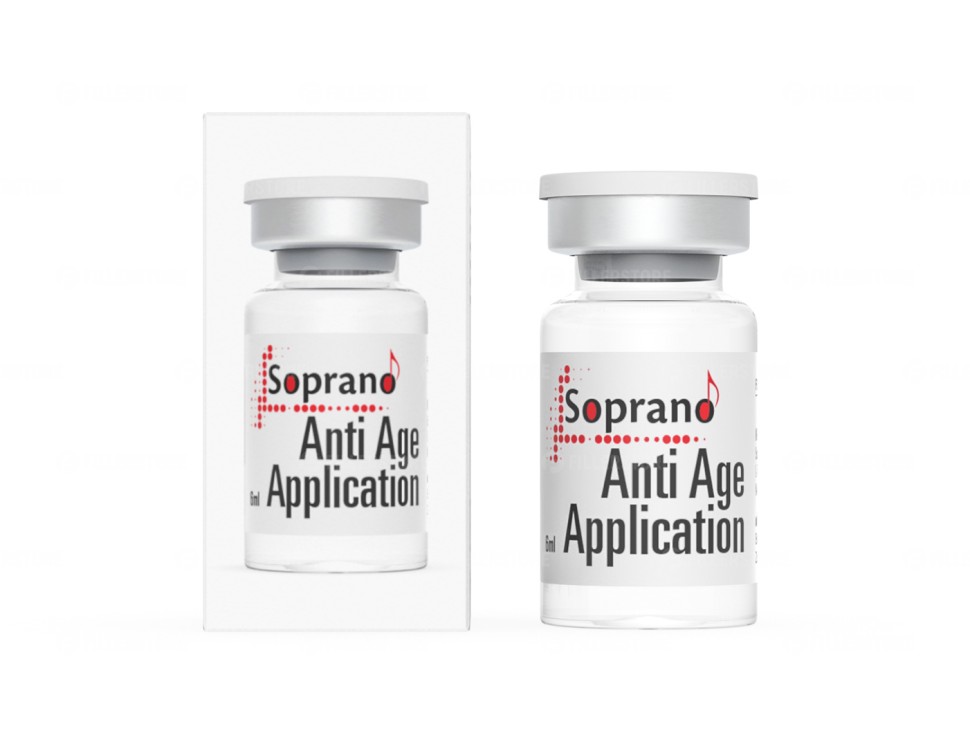 Soprano Anti Age application - специально разработан для коррекции признаков умеренного и выраженного фото- и хроноповреждения кожи лица и тела. Обеспечивает мощное омолаживающее воздействие на все структурные элементы кожи, участвует в коррекции иммунной системы, восстанавливает функциональную активность клеток, запускает процессы регенерации, нейтрализует действие свободных радикалов, предотвращает повреждение клеточных мембран. Компоненты препарата являются строительным материалом и используются для сборки новых коллагеновых фибрилл, что приводит к выраженному лифтинговому эффекту.